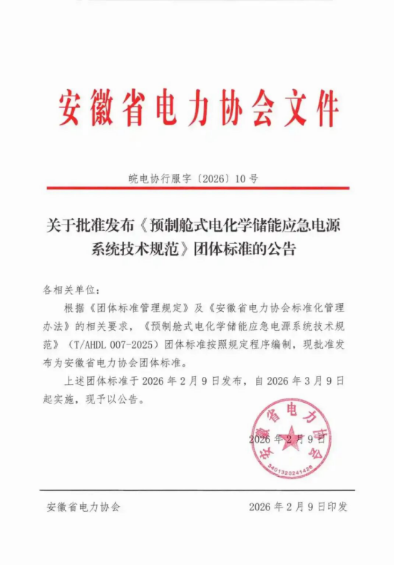 Today, Anhui Provincial Electric Power Association officially released the group standard "Technical Specifications for Prefabricated Cabin Electrochemical Energy Storage Emergency Power Supply Systems" (T/AHDL 007-2025). Led by Hanxing Energy, the standard went through multiple expert discussions, public consultations, and professional reviews. It was formally released on February 9, 2026, and will be implemented starting from March 9, 2026.